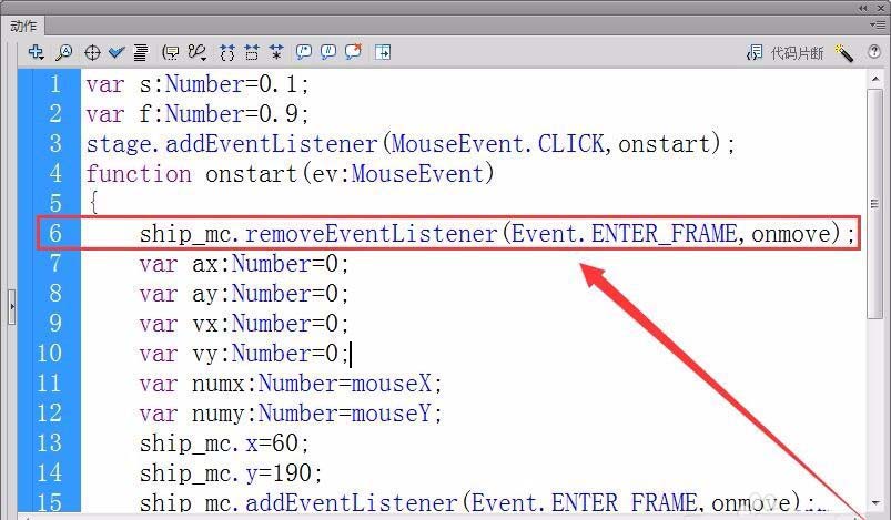 6、刪除輪船影片剪輯元件ship_mc的enterframe事件的偵聽器。