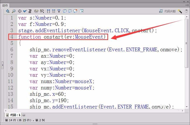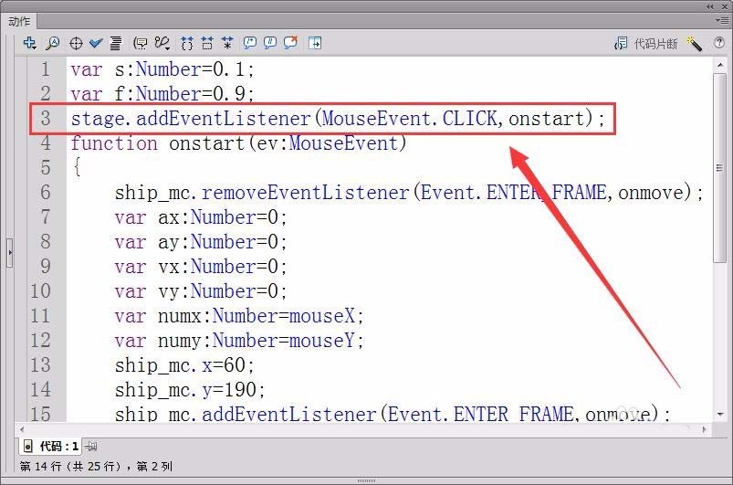 4、注冊舞臺的鼠標(biāo)單擊事件的偵聽器,控制輪船開始運動。