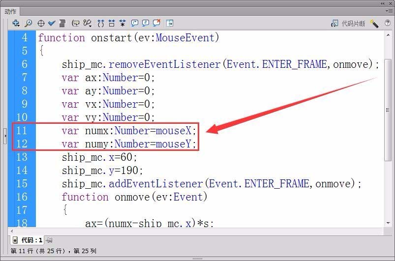 9、接著,定義兩個變量numx和numy,用于保存鼠標(biāo)的X軸和Y軸坐標(biāo)值。