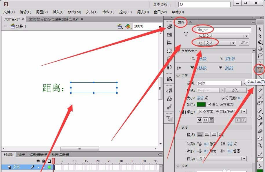 1、選擇“文本工具”在舞臺(tái)繪制一個(gè)動(dòng)態(tài)文本框,在“屬性”面板中,將“實(shí)例名稱”取名為“dis_txt”。