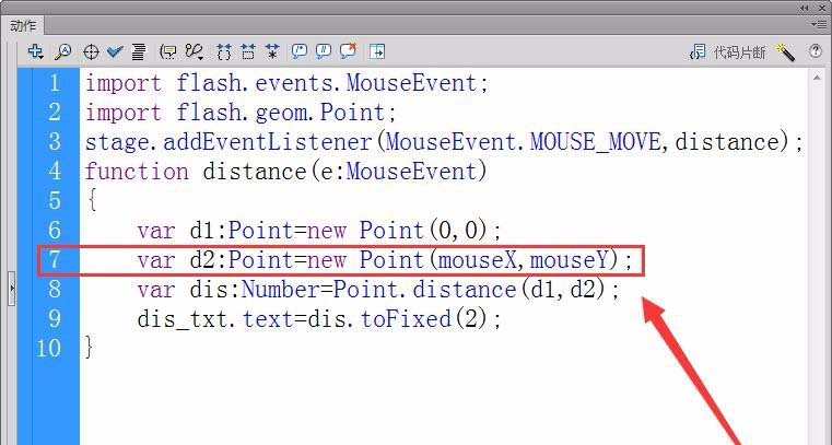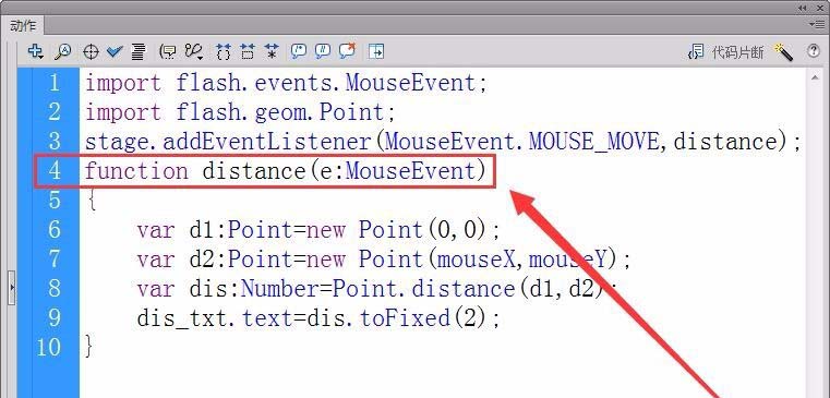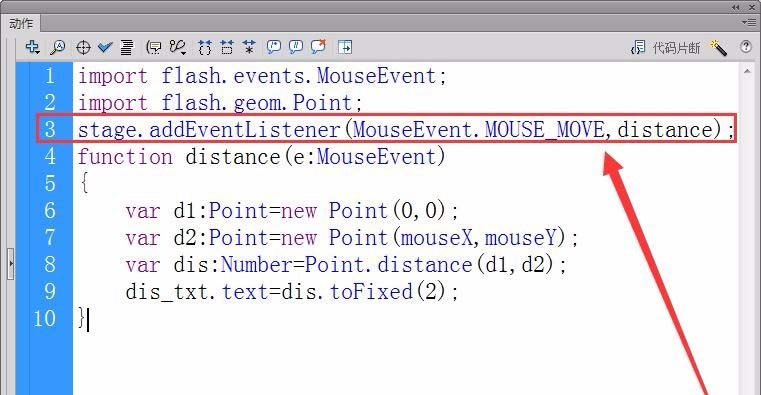 3、首先,注冊(cè)舞臺(tái)的鼠標(biāo)移動(dòng)事件的偵聽器,接收者函數(shù)為distance。
