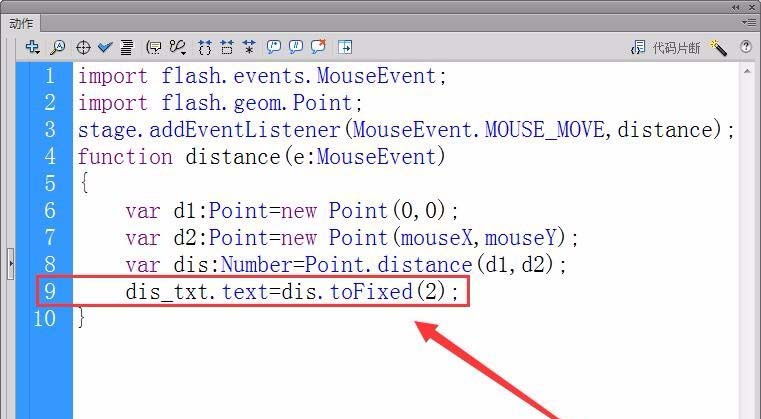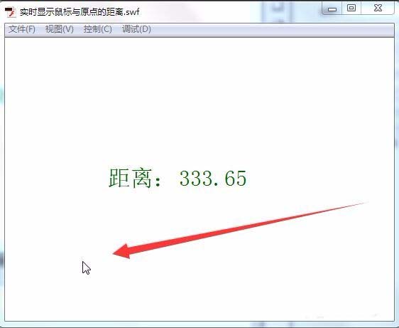 8、最后,在舞臺(tái)輸出鼠標(biāo)到原點(diǎn)之間的距離,距離值用toFixed函數(shù)保留小數(shù)點(diǎn)后兩位。