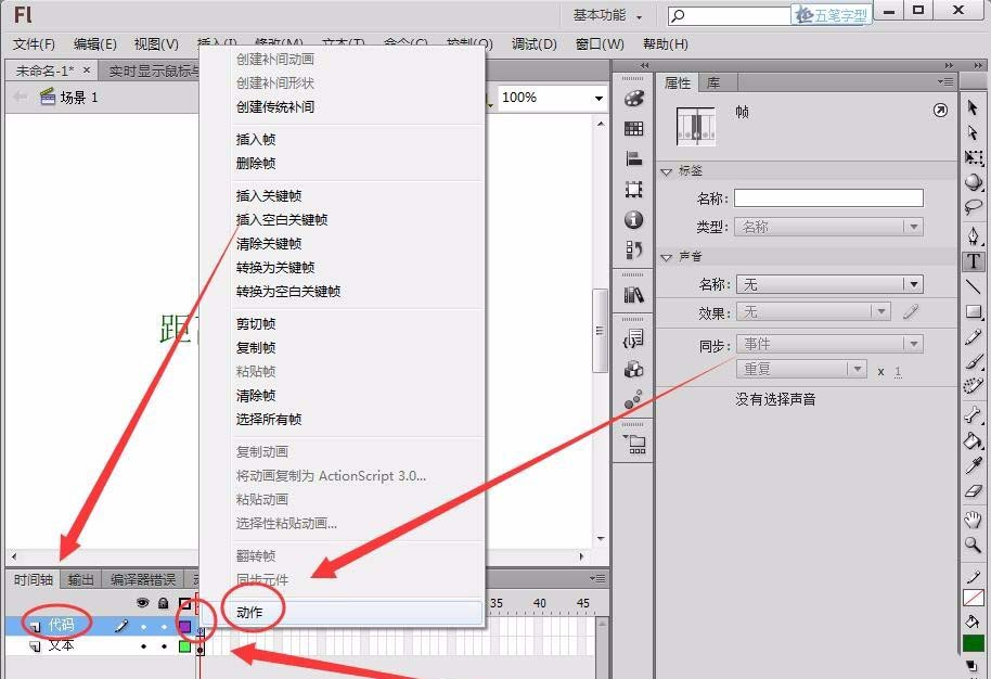 2、新建一個(gè)“代碼”圖層,在圖層的第1幀右擊,選擇“動(dòng)作”選項(xiàng)。