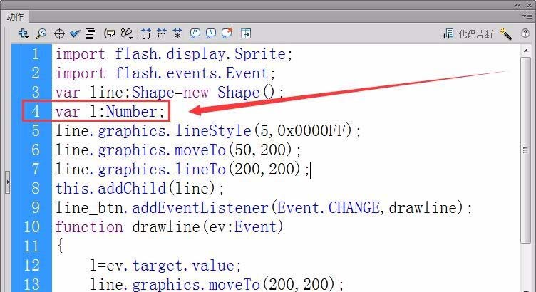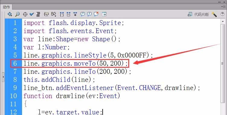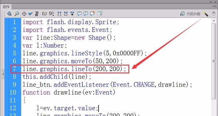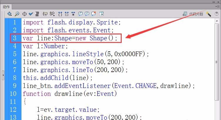 3、新建代碼圖層,打開動作面板。首先,創建一個Shape類實例,用變量line引用它,用來繪制直線。
