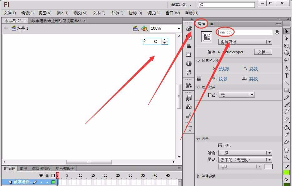 2、在舞臺選中NumericStepper元件,在屬性面板中將實例名稱取名為“line_btn”。