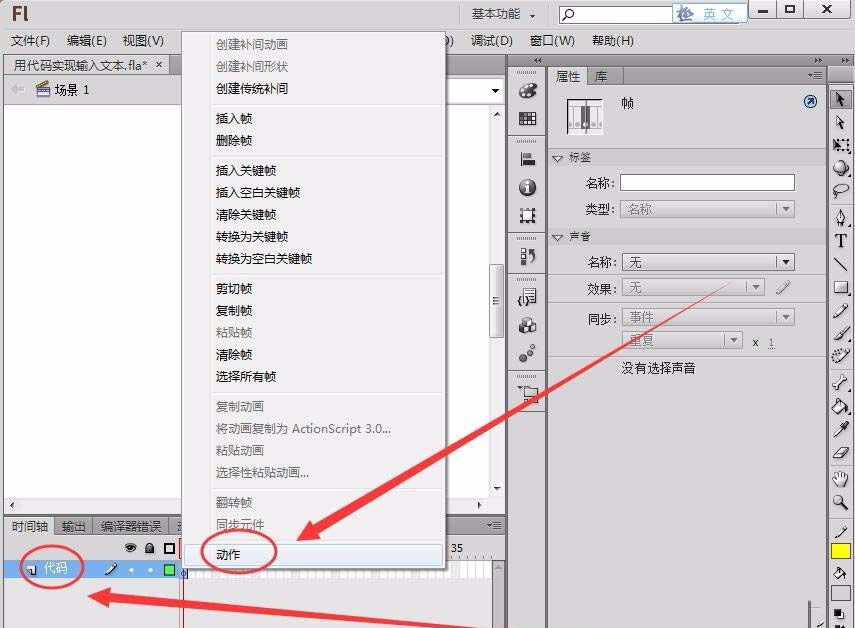 2、將圖層1重命名為代碼圖層,在圖層的第1幀右擊,打開動作面板。