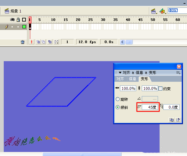 2、點擊選擇工具,將矩形選中,輸入ctrl+t,出現如圖的選框,點擊傾斜45,回車。