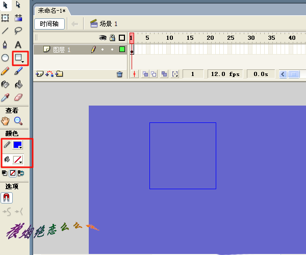8、點擊圖層3,創建時間軸,在15幀的位置插入空白關鍵幀,然后在15幀位置按剛才的方法畫矩形,填充顏色,如圖。