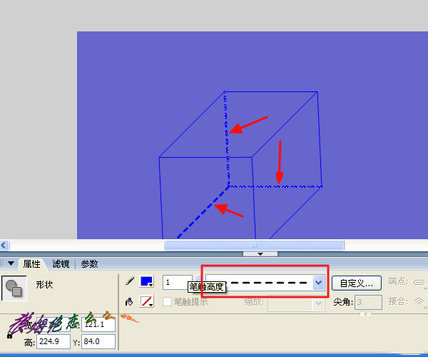 5、按住shift鍵,多選如圖所示的邊線,修改筆觸樣式為虛線。然后將它放入新的圖層2。(ctrl+x,剪切;ctrl+shift+v,原位置粘貼。)