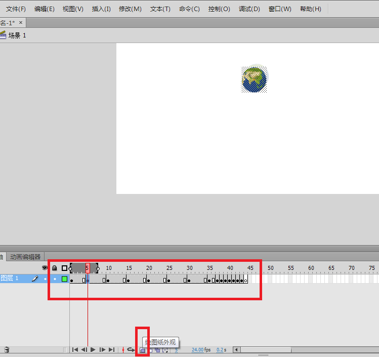 3、點(diǎn)擊第五幀,右鍵選擇插入關(guān)鍵幀,拖動(dòng)小地球的位置,分別以5、10、15、20、25、30、35幀處插入關(guān)鍵幀,選擇下方圖紙外觀,可以清楚看到不同時(shí)間尺度的關(guān)鍵幀的變化情況。