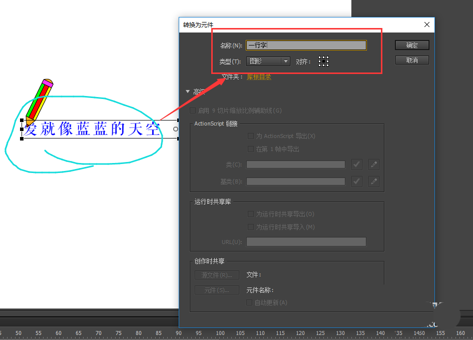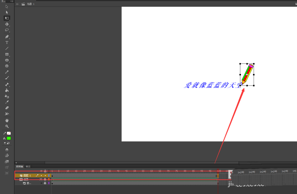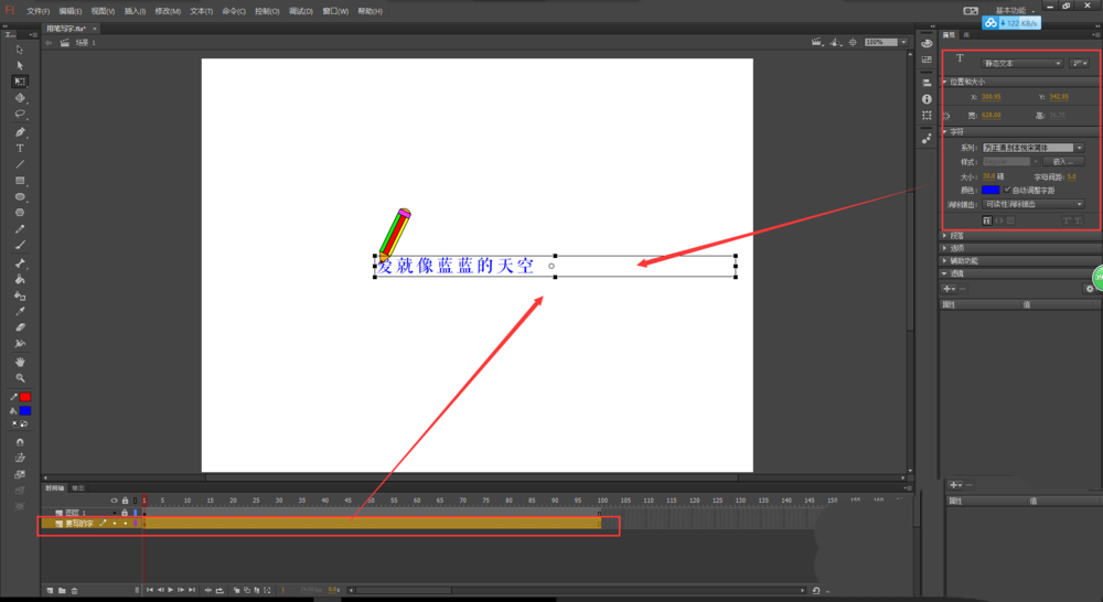 4、新建一個圖層,放在圖層1的下方,并命名為“要寫的字”,然后在場景畫布中輸入要寫的文字內容,并將小鉛筆移到文字內容的左側位置,然后將小鉛筆圖層1鎖定。選中文字按F8將其轉換為圖形元件,命名為“一行字”。再用任意變形工具,將文字內容做一點傾斜處理。