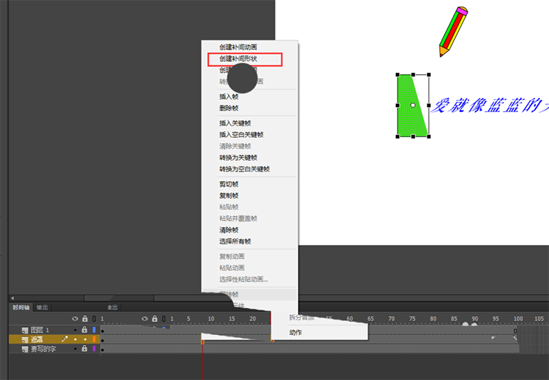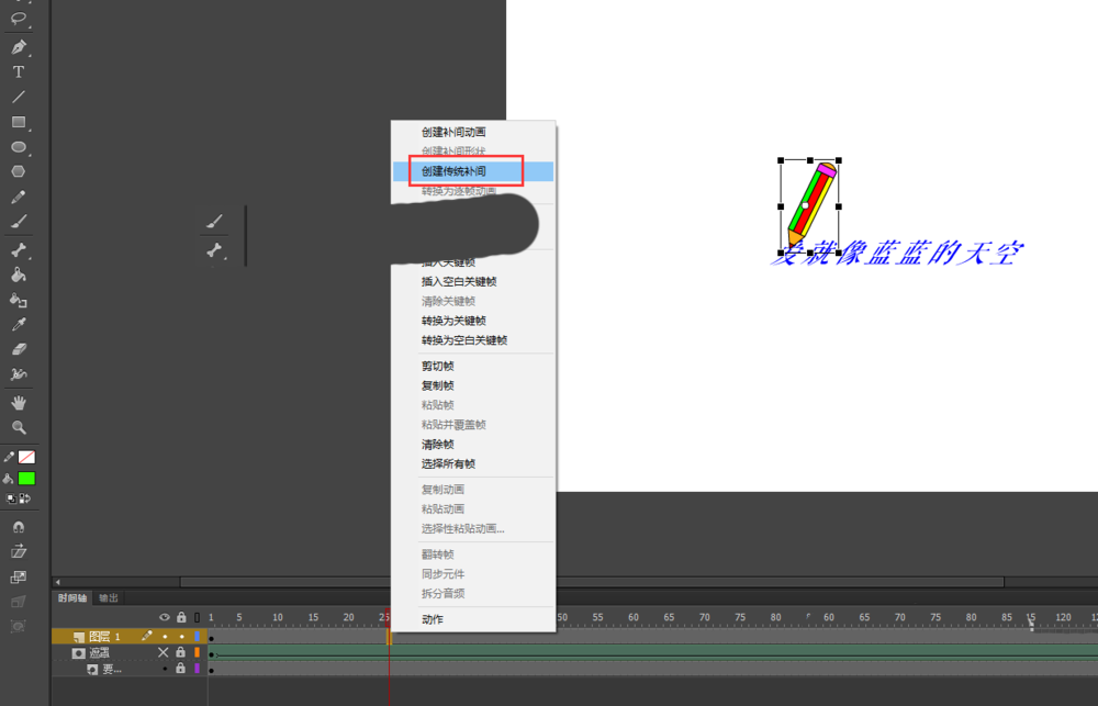 6、右鍵遮罩層將其轉換為真正的遮罩圖層,選中圖層1的小鉛筆,在圖層1第一幀位置將小鉛筆移到文字的左側,在第100幀插入關鍵幀,將小鉛筆移到文字的右側,然后在第一幀與第100幀之間創建一個傳統補間動畫。測試動畫,一個用筆寫字的動畫效果制作完成。