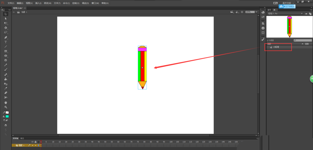 1、打開flash二維動畫軟件,新建一個動畫項目,首先將小鉛筆元件拖入到場景畫布中。