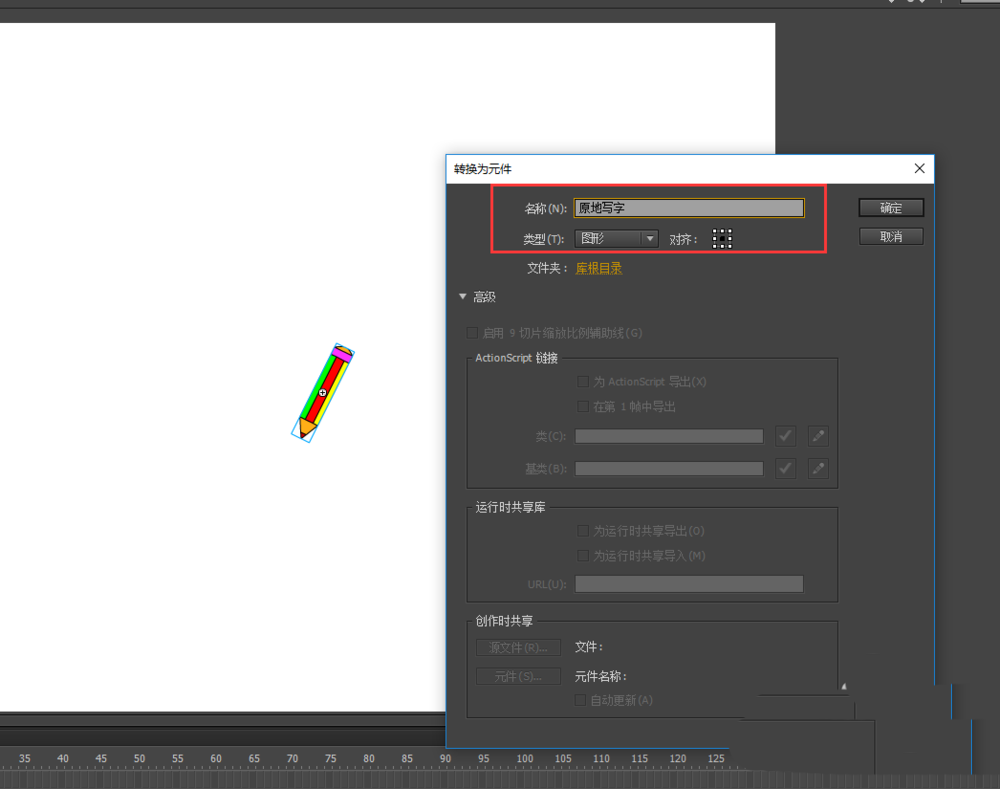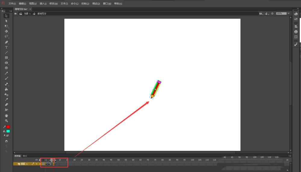 2、選擇任意變形工具,將小鉛筆進行縮小并旋轉一定角度;然后選中小鉛筆按F8將其轉換為圖形元件,元件命名為“原地寫字”。