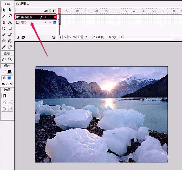 5、在“矩形遮蔽”圖層繪制一個矩形。縮小矩形大小,并且把矩形放置在舞臺左側外部區域。