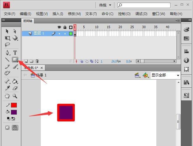3、再點擊工具欄上的矩形工具,在工作區中繪制出一個矩形。我們看到,矩形的邊框即是筆觸的顏色,內部則是填充顏色。