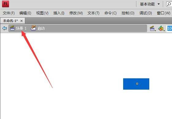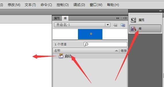 4、在左上角點擊場景1,回到場景。在右側的面板處點擊庫,將按鈕元件按住拉到場景中。