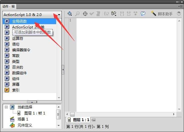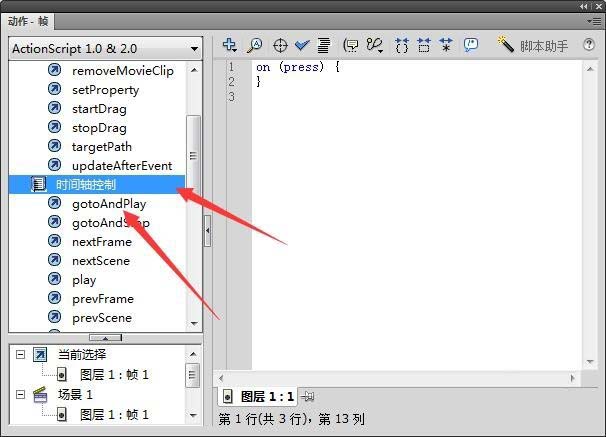 8、接下來點擊在代碼的大括號內,再點擊左側的時間軸控制,點擊gotoAndPlay。