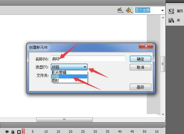 2、彈出創建新元件,在名稱處輸入按鈕名稱,在類型后面點擊選擇按鈕后確定。