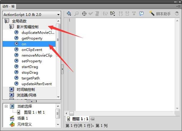 6、彈出動作對話框。在左上角選擇ActionScript1.0&2.0。點擊全局函數。再點擊影片剪輯控制,點擊on動作。