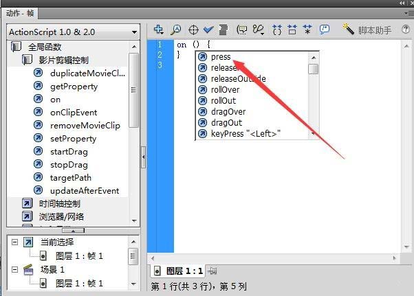 7、右側出現on的動作代碼,下方出現代碼提示框,選擇需要的代碼,如press。該代碼就進入on后面的括號中。該代碼的意思即為“當點擊按鈕時”