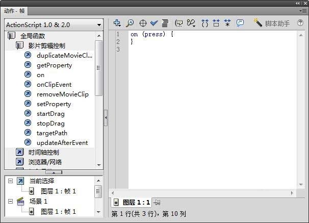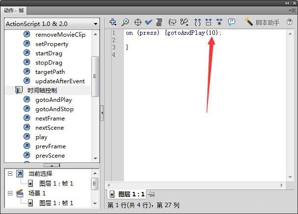 9、在gotoAndPlay后面的括號中輸入要跳轉到的幀位數。比如10。整個代碼的意思即為“當點擊按鈕時,跳轉到第10幀處,從第10幀處開始播放后面的內容”。