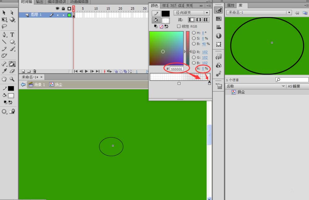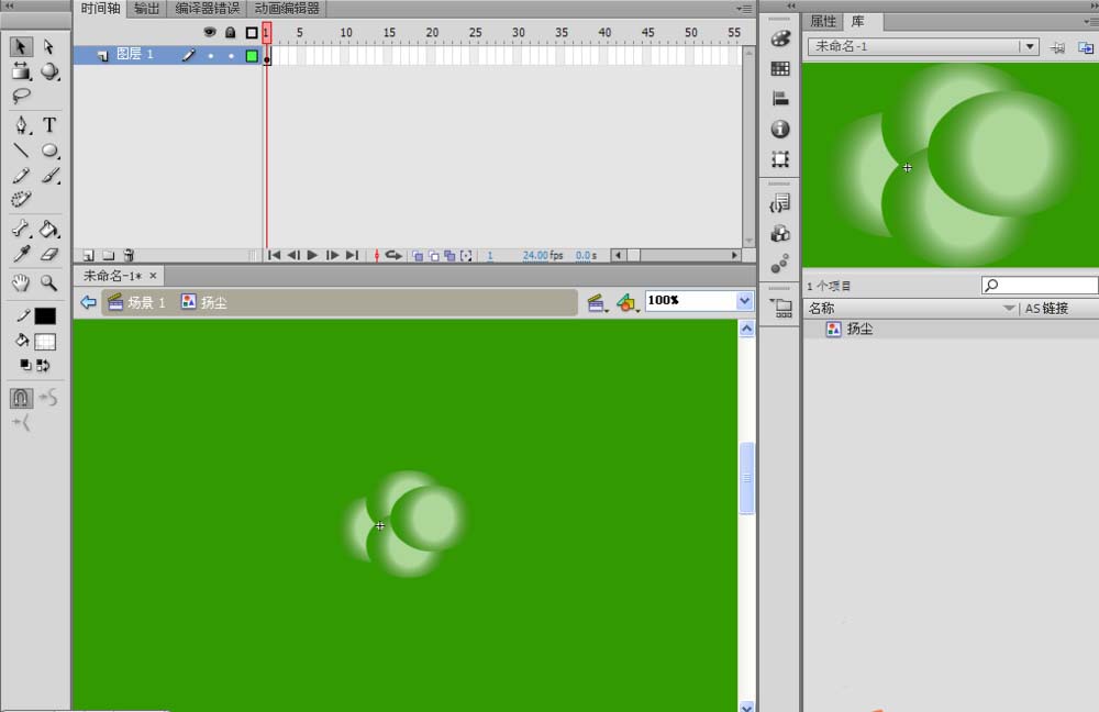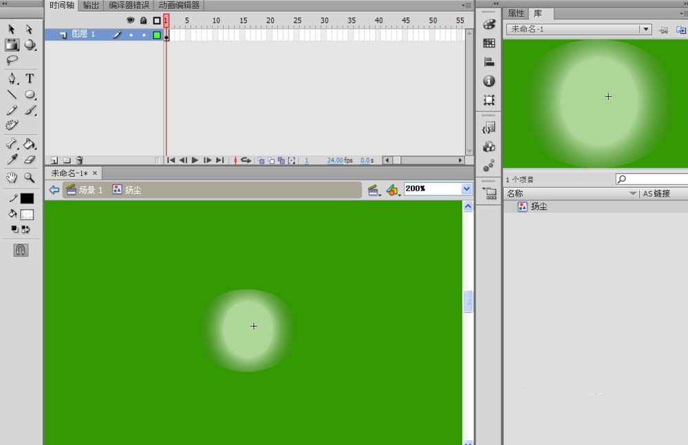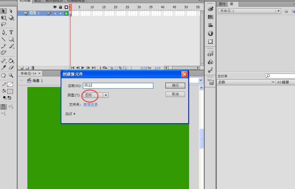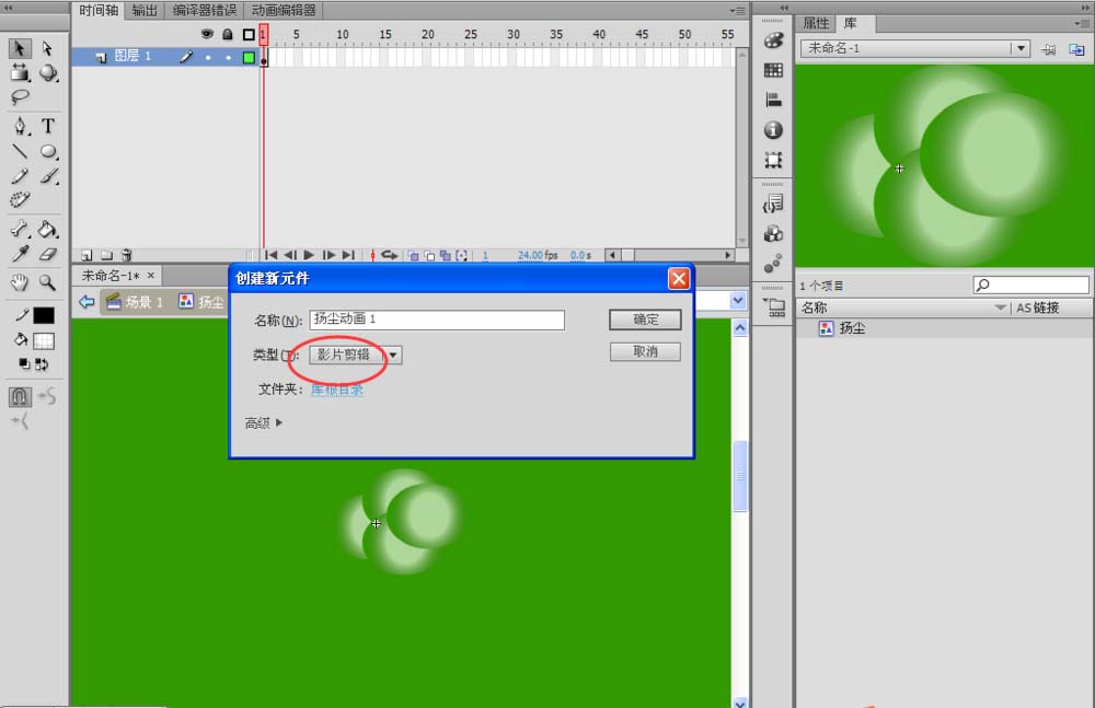 5、新建影片剪輯元件,將剛剛做好的圖形元件拖到第一幀處