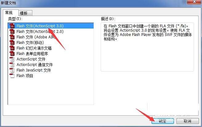 2、彈出新建文檔對話框,在對話框中選擇Flash文件(ActionScript3.0),按確定新建動畫文檔。