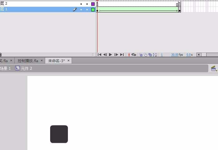 2、新建一個影片剪輯,制作形狀移動效果如圖所示。在第一幀和最后一幀加代碼:stop();