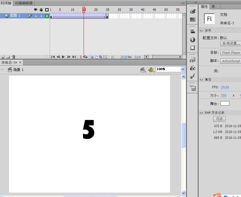 1、打開FLASH CS6,新建FLASH文檔,在第一幀處,插入一個靜態文本(這里小編插入一個數字“5”)