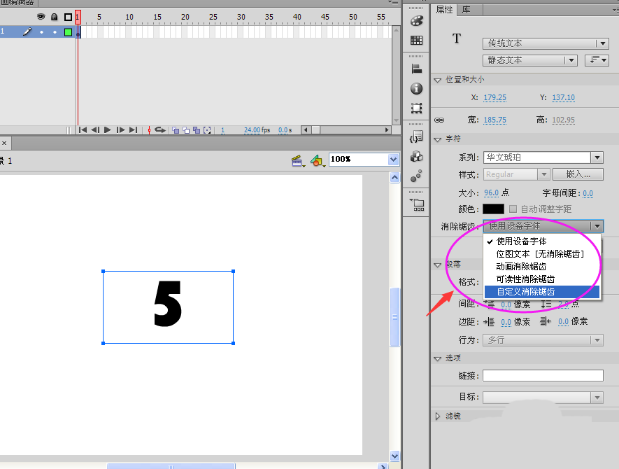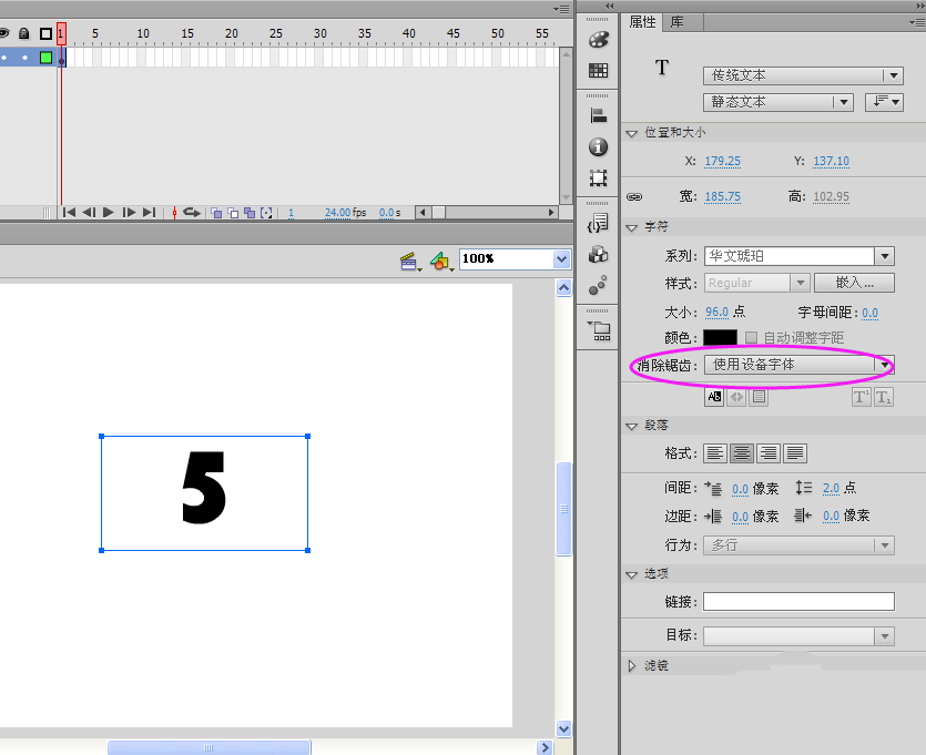 6、其實,在制作這個動畫的一開始,我們就犯了一個非常細小的錯誤,小編個人認為這是FLASH CS6 自身的BUG,那就是在字體屬性的消除鋸齒一欄,我們使用了設備字體 ...