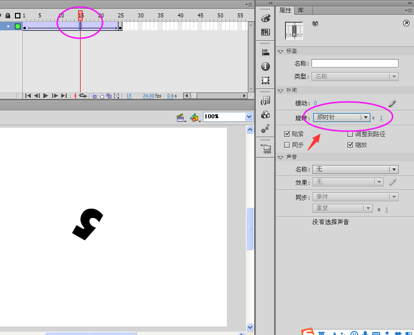 3、選擇第15 幀或補間動畫上的任意一幀,將其幀屬性--補間中的旋轉,改為順時針旋轉一次...