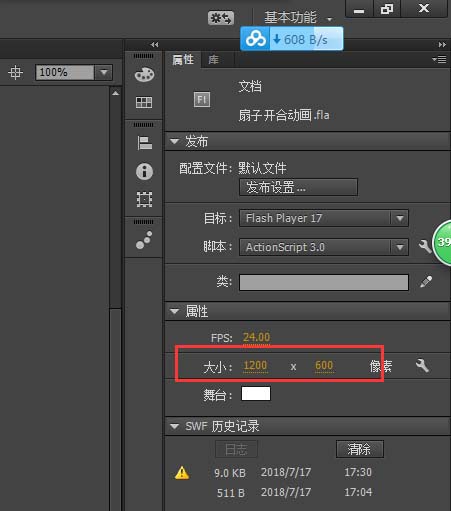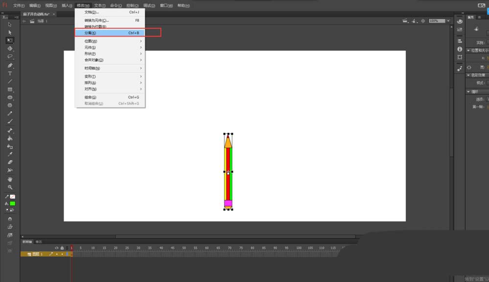 2、在場景空白處單擊,然后在屬性窗口中設置畫布的大小為1200*600像素;用任意變形工具將小鉛筆進行上下反轉,并適當減小一下寬度,然后將小鉛筆進行分離;在拉伸小鉛筆。