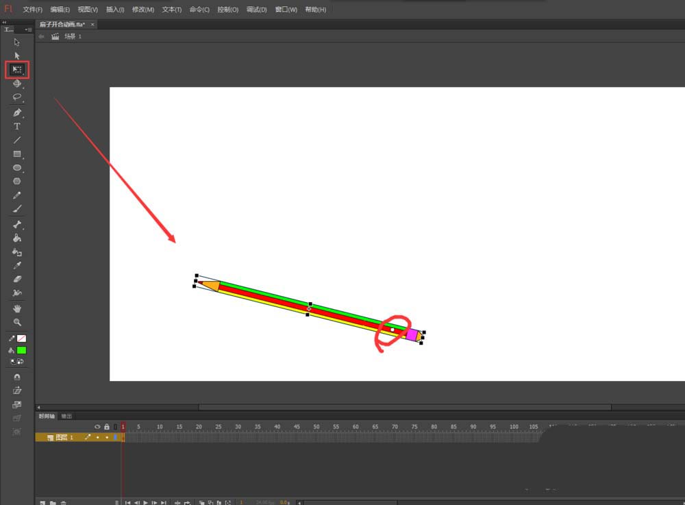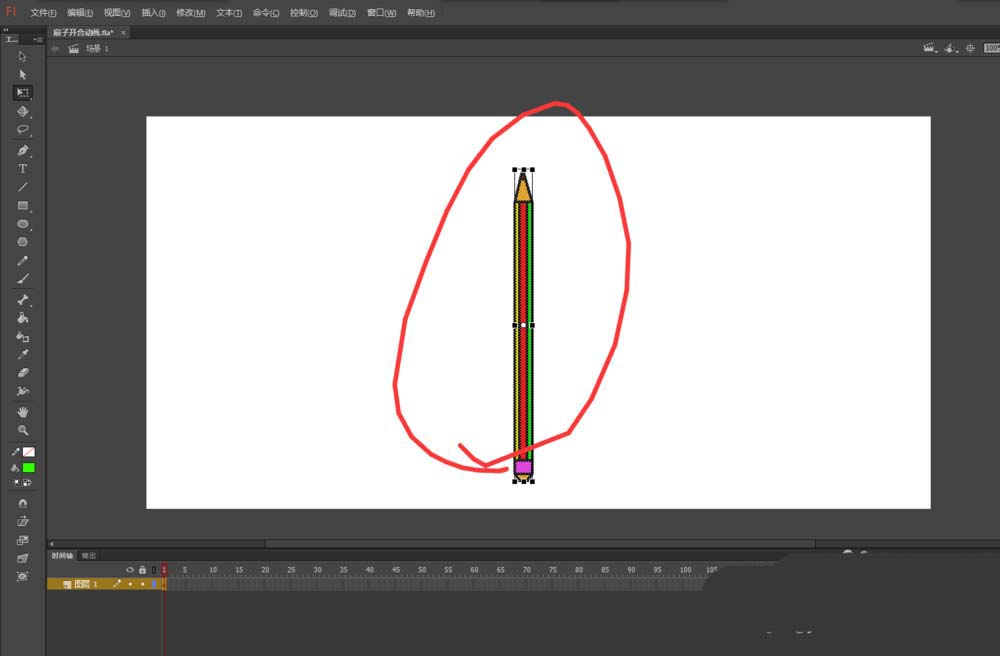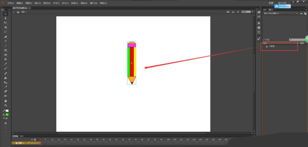 1、打開flash軟件,新建一個動畫項目,在庫中將對象元件拖入到場景畫布中。(說明:這個元件是個小鉛筆,但是不影響我們制作扇子開合動畫)