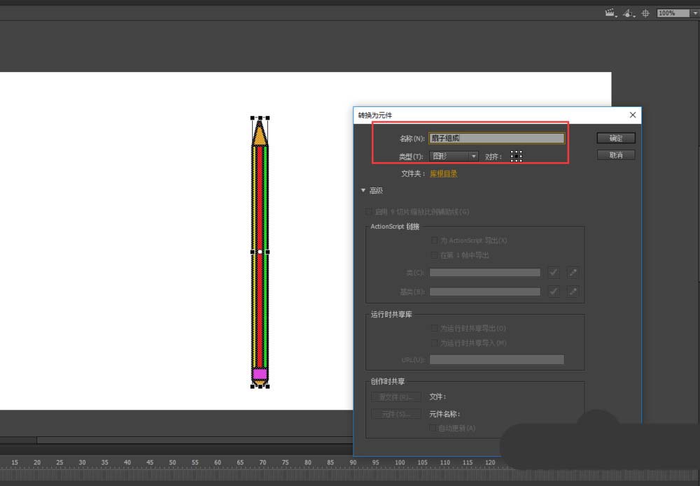 3、在選中整個拉伸后的小鉛筆,按F8將其轉換為一個新的圖形元件,命名為“扇子組成”;在任意變形工具下,將新的元件的中心點移到靠下的位置,然后旋轉對象將其旋轉到左側。