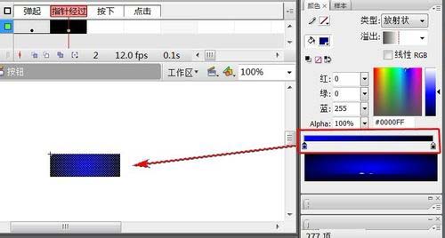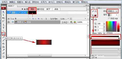 6選擇“彈起”幀,用“矩形工具”繪制一個(gè)矩形,并設(shè)這個(gè)矩形邊框?yàn)?ldquo;無”,類型為“放射線”,填充色為“紅—黑”漸變。