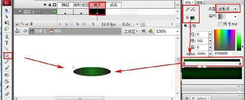 10、用“橢圓工具”繪制一個(gè)橢圓形,并設(shè)這個(gè)矩形邊框?yàn)?ldquo;無”,類型為“放射線”,填充色為“綠—黑”漸變。