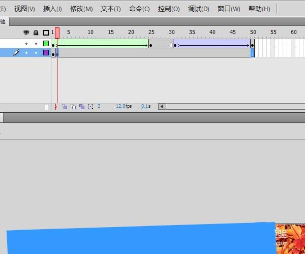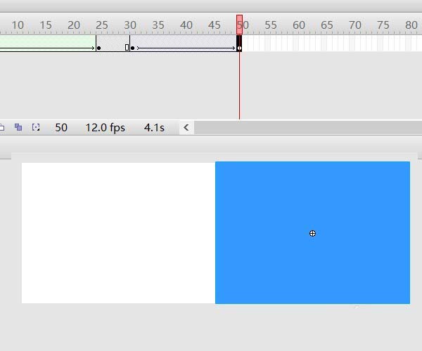 7、第50幀矩形移至舞臺右側(cè),回到第30幀創(chuàng)建補間動畫。