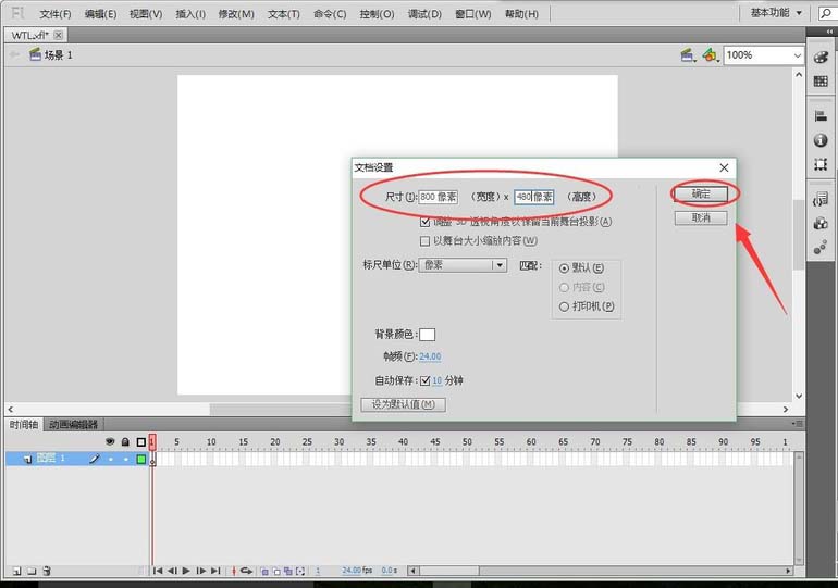 6、由于液晶屏的分辨率是800X480,所以要把文檔的尺寸設(shè)置成“800像素寬度X480像素高度”。