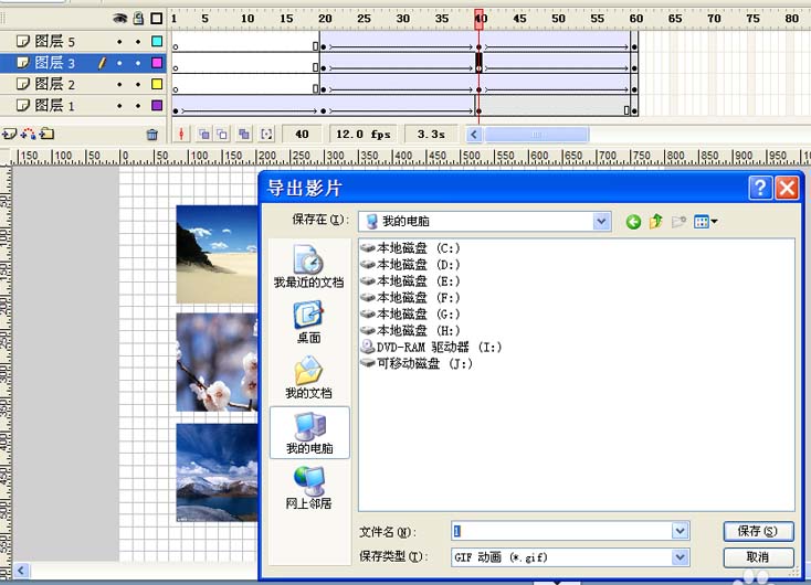 10、執(zhí)行文件-導(dǎo)出-導(dǎo)出影片命令,在彈出的對(duì)話框中設(shè)置保存類型為gif動(dòng)畫格式,輸入名稱,點(diǎn)擊確定按鈕。