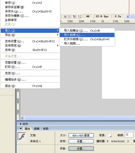 1、首先啟動(dòng)flash8,新建一個(gè)大小為800*600,背景顏色為白色,幀頻為12fps的文件。