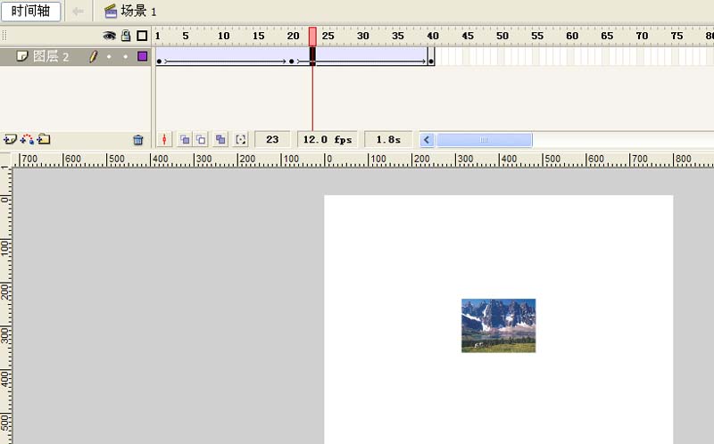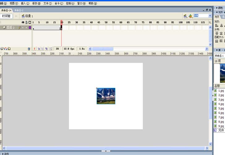 7、新建圖層2,在第20幀處插入關(guān)鍵幀,從庫中拖拽一張圖片到舞臺(tái),將其轉(zhuǎn)換化為影片剪輯文件,設(shè)置位置x為396,y為123.3,啊alpha為0%,在第40處插入關(guān)鍵幀,大小設(shè)置為200*145,x為299.9,y為67.6,創(chuàng)建補(bǔ)件動(dòng)畫。