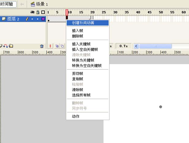 5、在圖層1的1-20幀之間選擇任意一幀,右鍵單擊從下拉菜單中選擇創(chuàng)建補(bǔ)件動(dòng)畫選項(xiàng),按回車鍵可以測試動(dòng)畫效果。