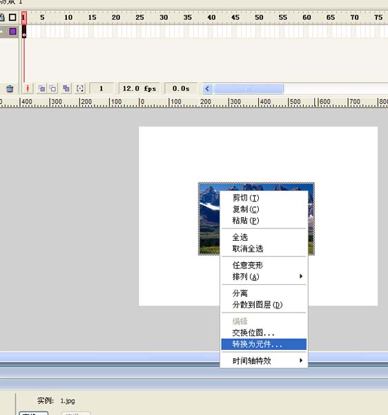 3、拖拽一張圖層到舞臺(tái)上,右鍵單擊該圖片,從下拉菜單中選擇轉(zhuǎn)換為元件選項(xiàng),在彈出的對(duì)話框中設(shè)置類型為影片剪輯,點(diǎn)擊確定按鈕。