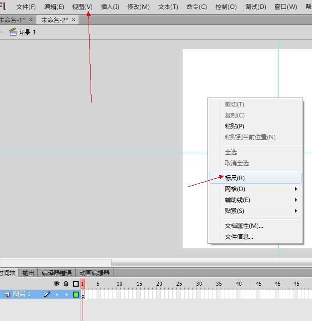 1、打開Flash cs6軟件,在菜單欄-視圖菜單中,可以找到標尺和參考線,勾選標尺,然后在顯示的標尺上就可以用鼠標拖出參考線。