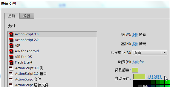 1、新建文檔選擇初始界面中的“ActionScript3.0”,設置文檔寬240像素,高320像素,幀頻6fps,背景顏色為#BBD556,如圖1所示。將素材文件夾中的“花.png”圖片導入到庫。