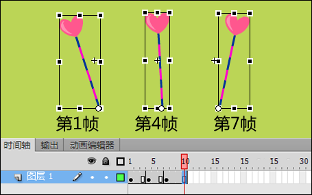 3、選中當前圖層第4幀,按F6插入關鍵幀,使用“任意變形工具”向右旋轉一定的角度,使花朵朝中間。再選中當前圖層第7幀,按F6插入關鍵幀,再次使用“任意變形工具”向右旋轉,使花朵朝右,如圖3所示,完成一個花朵擺動的逐幀動畫。選中第10幀,按F5插入普通幀,使花擺動的每個關鍵幀持續時長一致。
