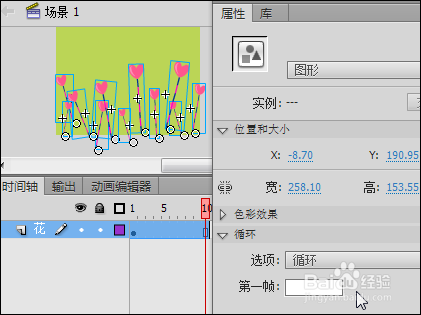 4、回到“場景1”,在“時間軸”面板上將當前圖層重命名為“花”,將“庫”面板中“花擺動”圖形元件拖入舞臺并適當調整其大小和位置,選中該實例,在“屬性”面板“循環”選項“第一幀”處填寫1~10的任意數字,如圖4所示。