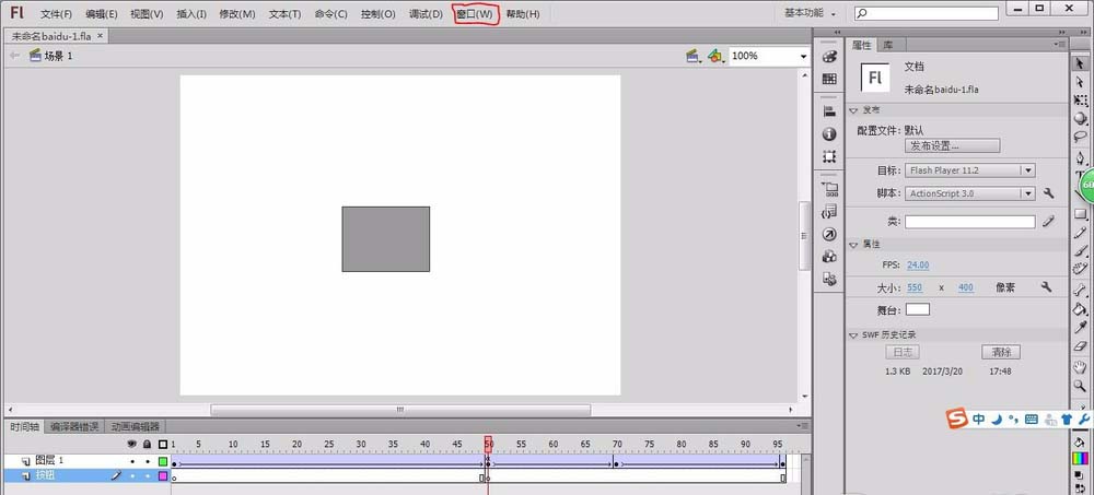 4、點(diǎn)擊“按鈕”圖層,在第50幀插入關(guān)鍵幀,然后按鈕可以隨便選擇,在這里我使用的是【classic buttons】中【Arcnde buttons】中【arcnde buttons - blue】,最后拖動(dòng)到舞臺(tái)(窗口)即可