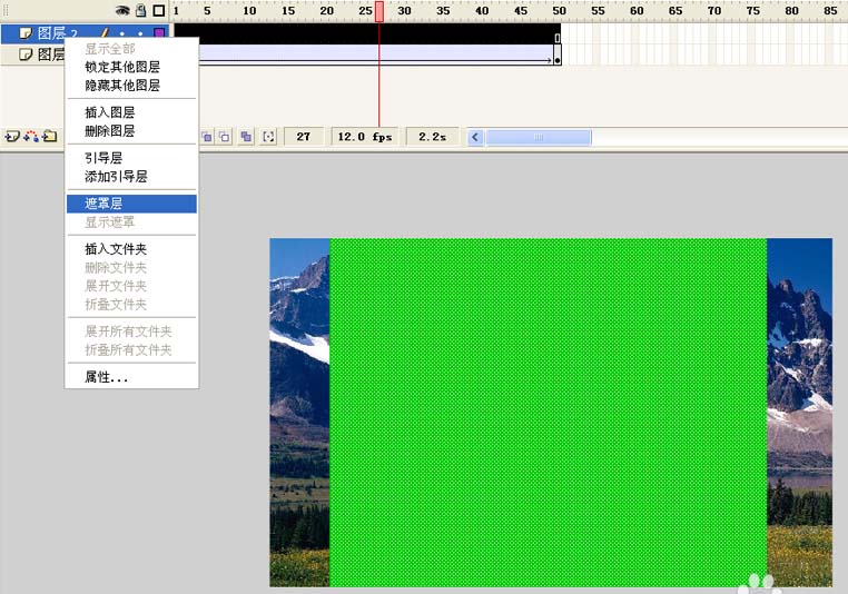 5、右鍵單擊圖層2,從下拉菜單中選擇遮罩層,將圖層2設置為遮罩層,圖層1為被遮罩層。